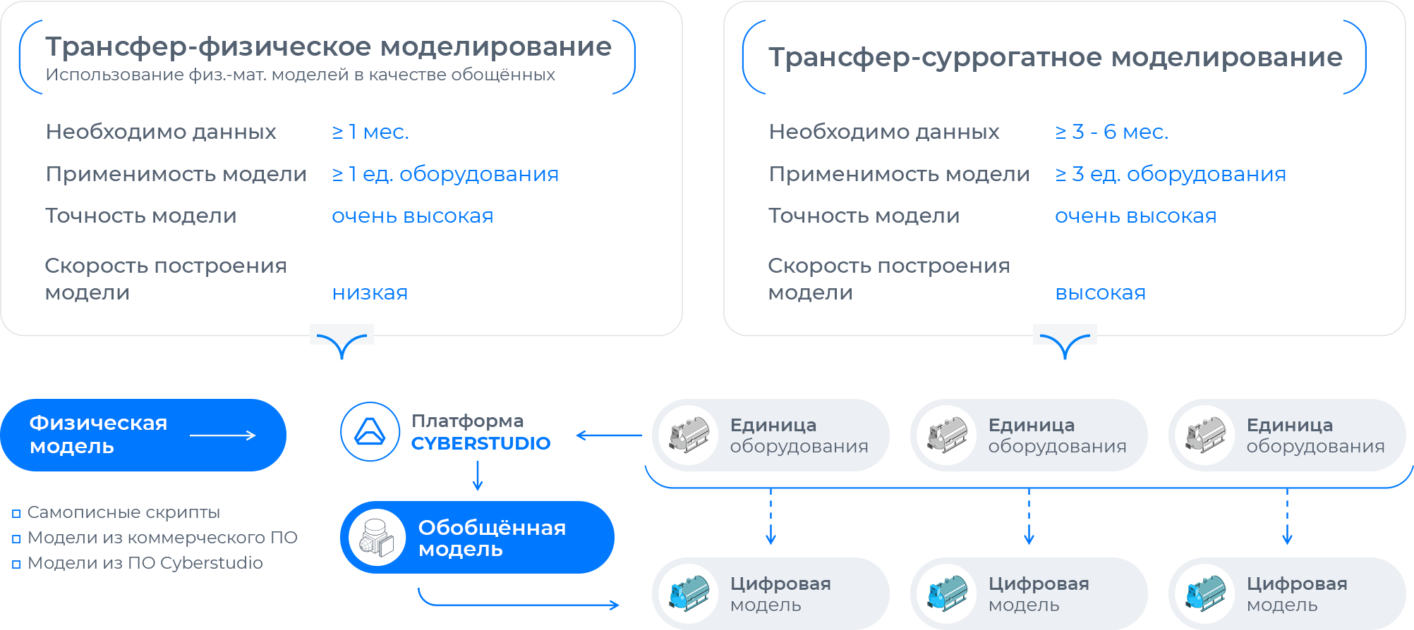 На эксплуатационных данных строятся модели машинного обучения (суррогатные модели). Также могут строиться физико-математические модели оборудования для повышения точности моделей в условиях нехватки данных (гибридное моделирование).